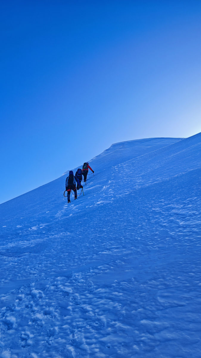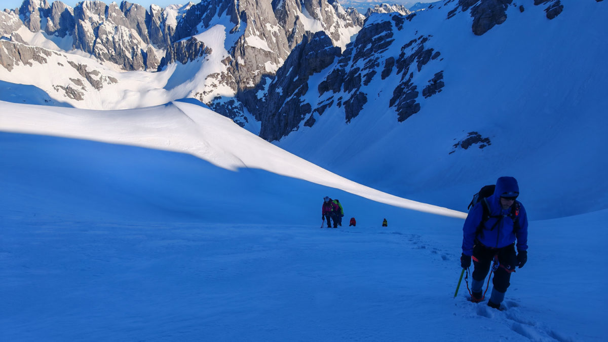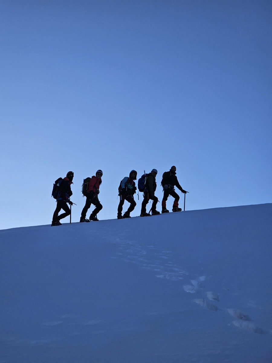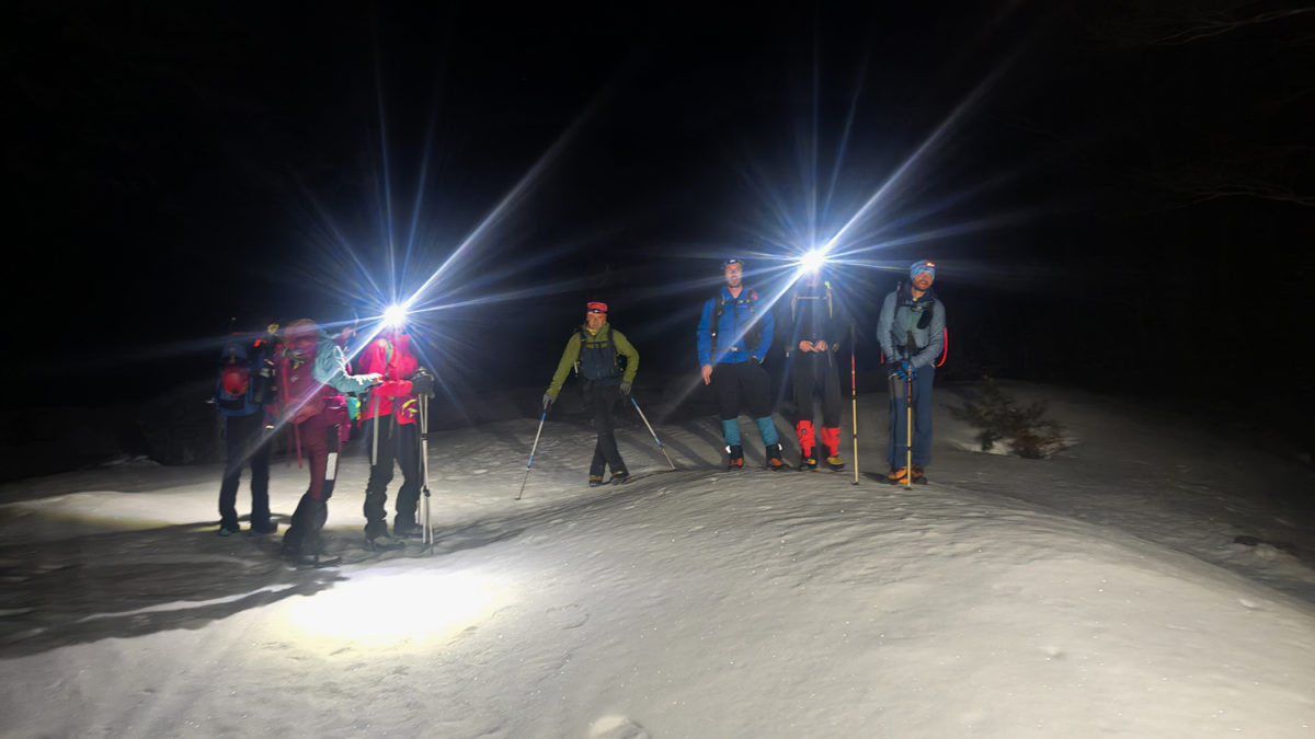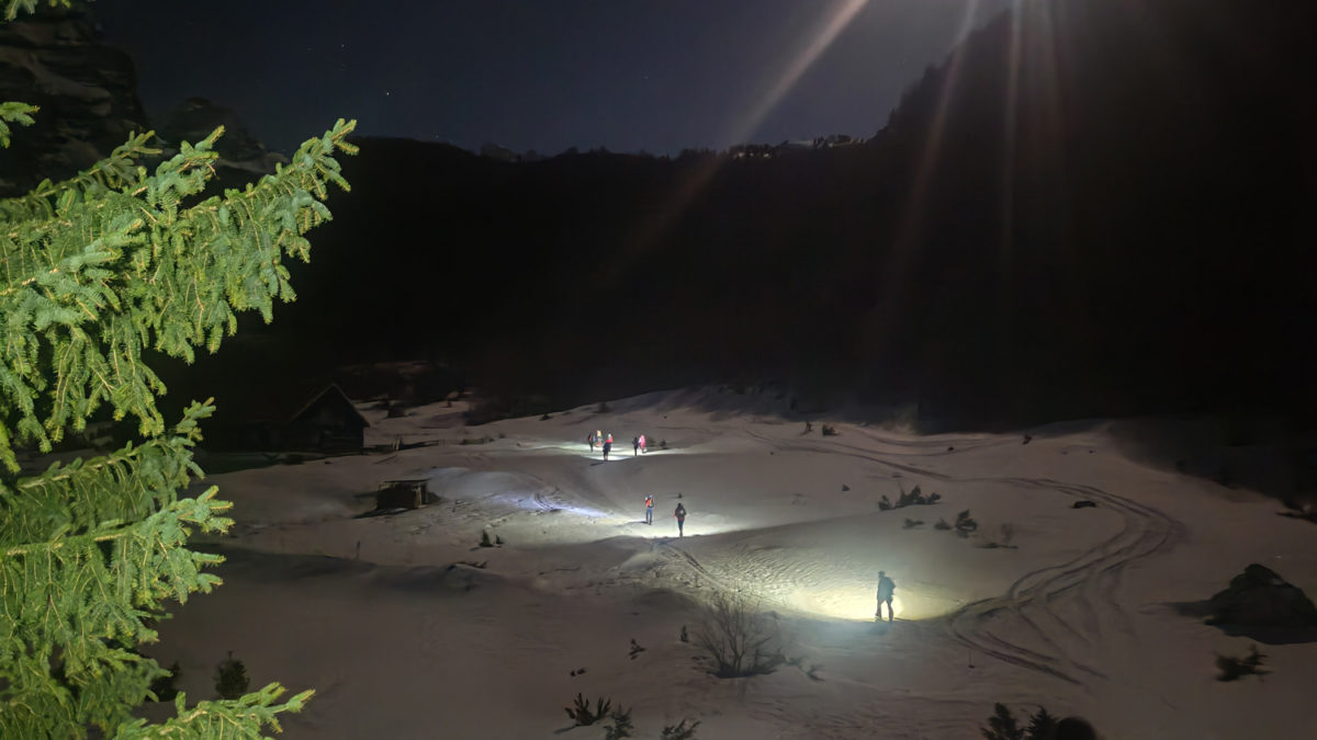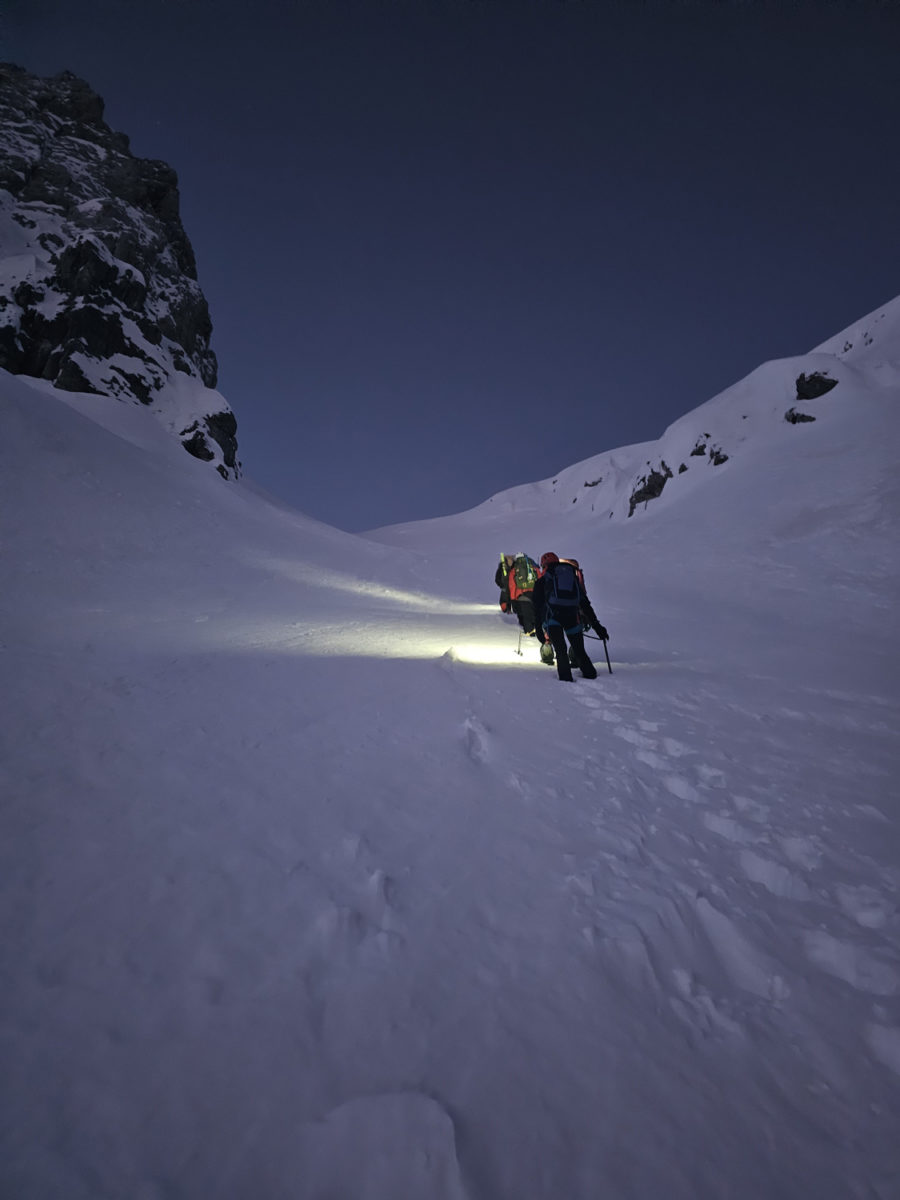 Благи мраз нас је разбуђивао, а чеоне лампе освјетљавале пут кроз снијег док је тишина планине прекидана само шкрипом залеђеног снијега под ногама.