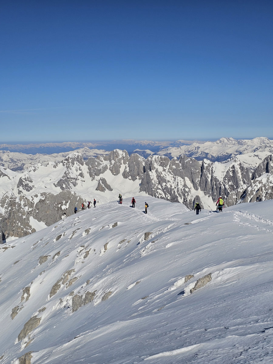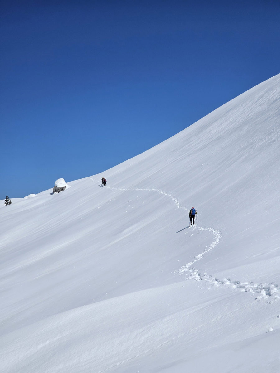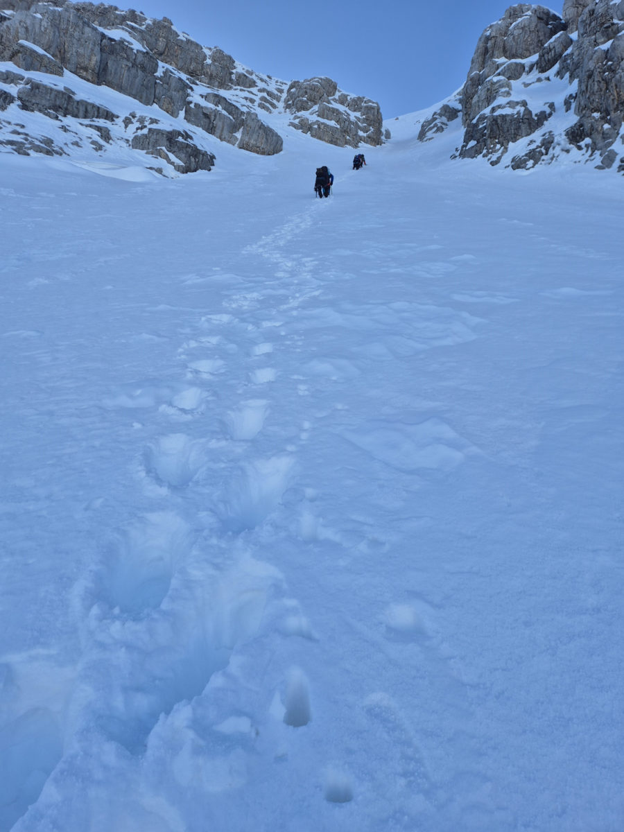 Kретање према врху захтијевало је сталну концентрацију и сигурну технику кретања. Сваки корак морао је бити стабилан. На појединим дионицама наилазили смо на трагове недавне лавине, што је додатно појачало опрез и подсјетило колико су зимски успони озбиљан подухват. Процјена терена и потенцијалне опасности од нових лавина била је неопходна током кретања.