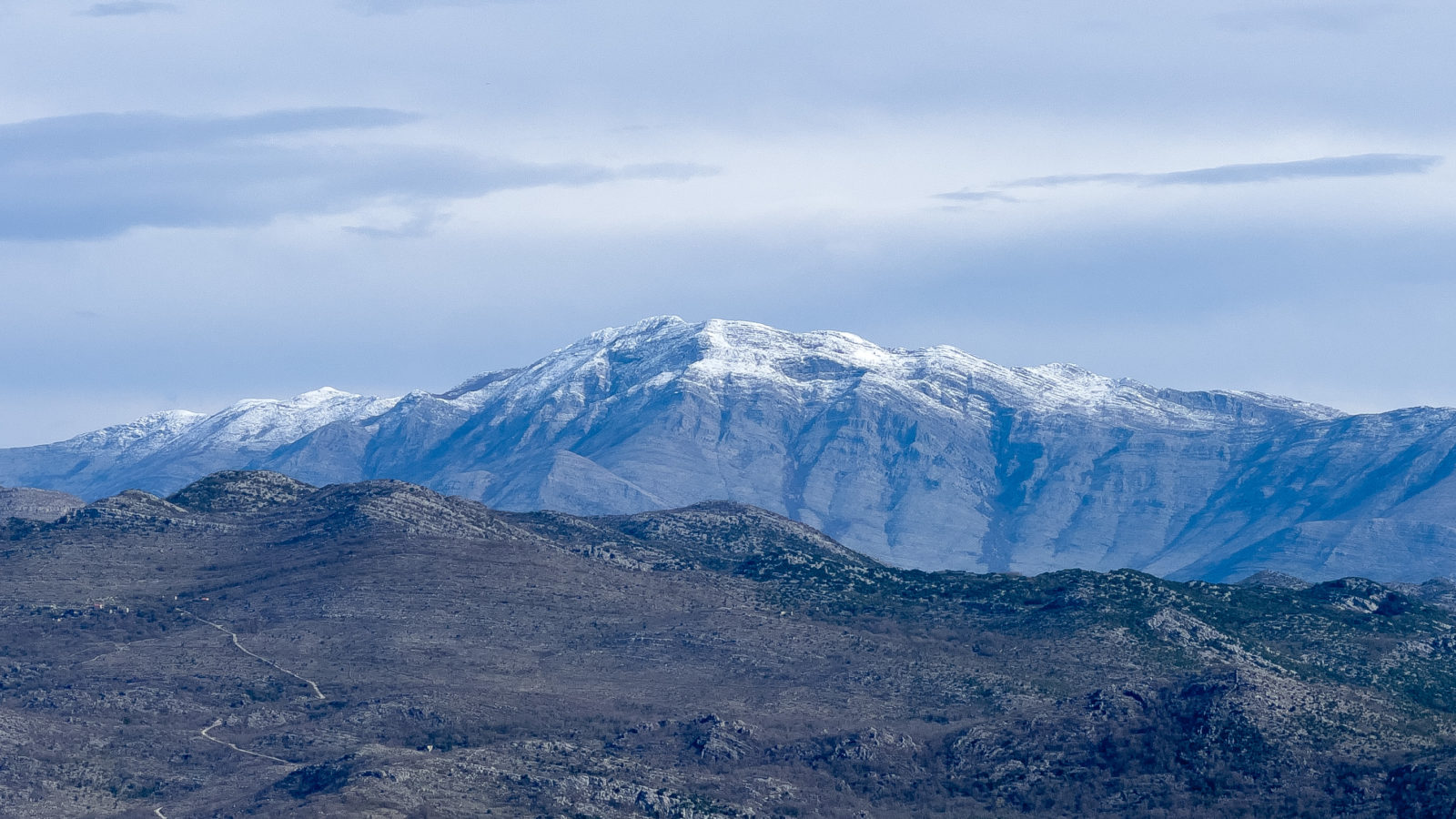 Камена громада Бјеласнице и врх Мотка, снимак са Оштре главице повише Мокошице – Дубровник